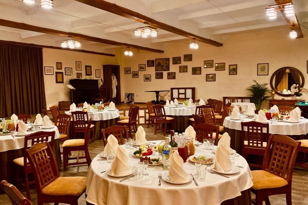 Малий та великий банкетні зали, ресторан і тераси для святкових подій та корпоративних вечорів.