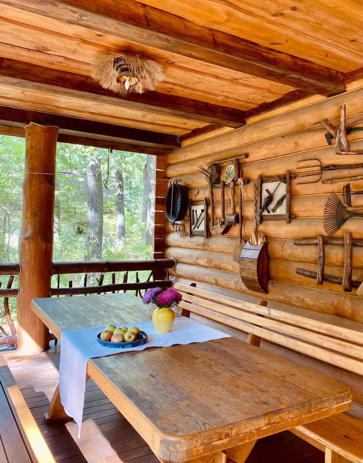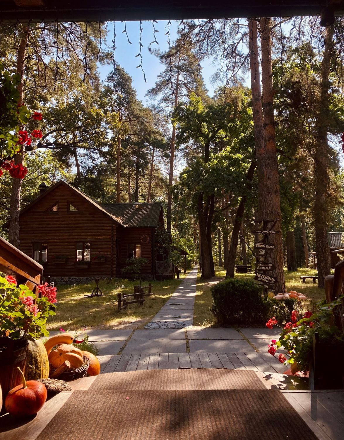 В летнее время для гостей возле ресторана открыта терраса. Деревянная мебель, деревенские мотивы в интерьере и живописные пейзажи позволяют сразу получать вкусовое и визуальное наслаждение. После того, как все блюда попробованы, можно прогуляться по территории комплекса.